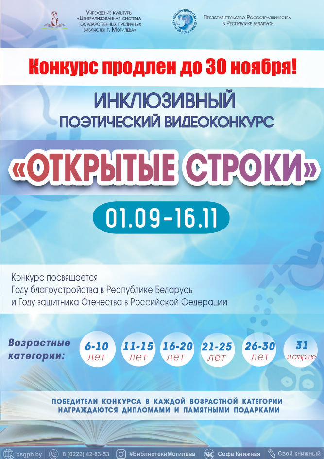 Приглашаем вас принять участие в инклюзивном поэтическом видеоконкурсе «ОТКРЫТЫЕ СТРОКИ», который проводится в рамках Года благоустройства в Республике Беларусь и Года защитника Отечества в Российской Федерации.