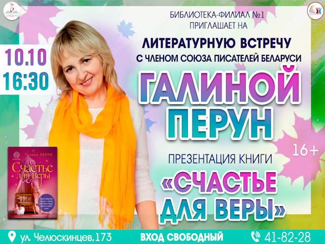 10 октября в 16:30 в библиотеке-филиале №1 им. Я. Коласа состоится литературная встреча с членом союза писателей Беларуси Галиной Перун.