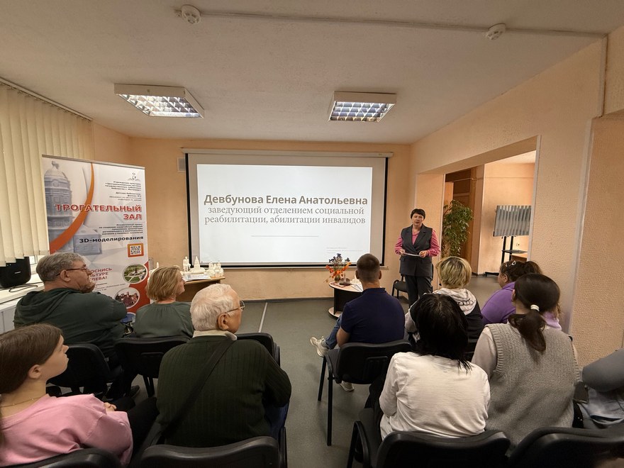 Заведующий отделением социальной реабилитации, абилитации инвалидов Девбунова Елена Анатольевна познакомила участников с деятельностью учреждения и поделилась опытом работы с людьми, имеющими нарушения зрения.
