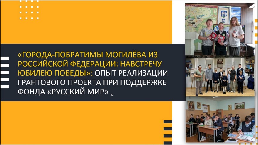 От учреждения выступила библиотекарь 1 категории информационно-идеологического сектора отдела обслуживания и информации центральной городской библиотеки им. К. Маркса – Капитонова Юлия Сергеевна с темой «Города-побратимы Могилева из Российской Федерации: навстречу юбилею Победы»: опыт реализации грантового проекта при поддержке фонда «Русский мир» освятив работу в юбилейный год Великой Победы.