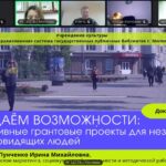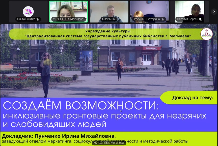 Участником от учреждения стала Пунченко Ирина Михайловна, заведующий отдела маркетинга, социокультурной деятельности и методической работы ЦГБ им. К. Маркса, с темой «Создаем возможности: инклюзивные грантовые проекты для незрячих и слабовидящих людей».