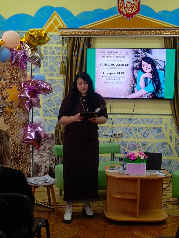 В ходе беседы автор рассказала о себе и своем творческом пути. Она является автором трех поэтических сборников: «Счастье», «29» и «#Настроение_осень». Ее творчество хорошо известно не только читателям, но и театральной публике. Пьеса «Прыгоды Заранкі і Янкі» поставлена на сцене Национального академического драматического театра имени Янки Купалы, а пьеса «Зуза» входит в репертуар Могилевского областного театра кукол.