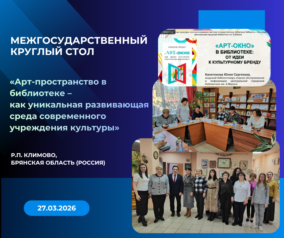 На межгосударственном круглом столе «Арт-пространство в библиотеке – как уникальная развивающая среда современного учреждения культуры» с докладом «Арт-окно» в библиотеке: от идеи к культурному бренду» выступила Капитонова Юлия Сергеевна, ведущий библиотекарь отдела обслуживания и информации центральной городской библиотеки им. К.Маркса. Организаторами мероприятия стали Брянская областная библиотека им. Ф.И.Тютчева и Климовская межпоселенческая центральная библиотека (Российская Федерация).