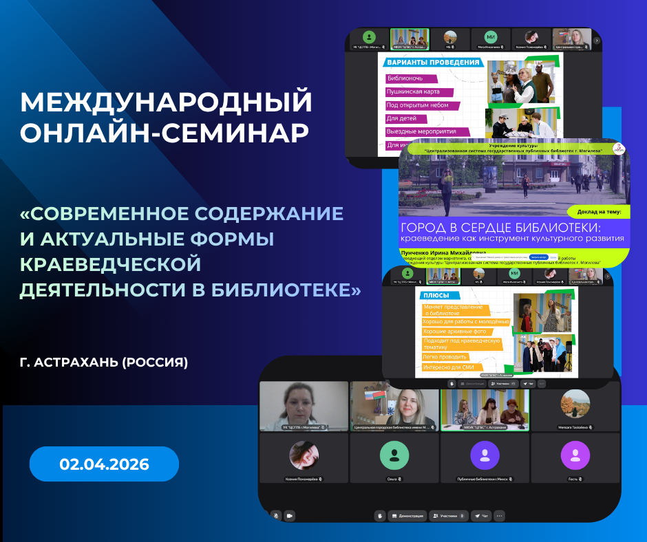 В международном онлайн-семинаре «Современное содержание и актуальные формы краеведческой деятельности в библиотеке» приняла участие Пунченко Ирина Михайловна, заведующий отделом маркетинга, социокультурной деятельности и методической работы центральной городской библиотеки им. К.Маркса. Она представила доклад «Город в сердце библиотеки: краеведение как инструмент культурного развития». Мероприятие состоялось в рамках празднования Дня единения народов Беларуси и России Организатором выступила Центральная городская библиотека МКУК «Централизованная городская библиотечная система» (г. Астрахань, Россия).